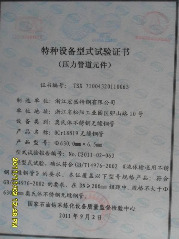 11年公司制造牌號(hào):0Cr18Ni9 規(guī)格:630mm*6.5mm 的大口徑薄壁不銹鋼管(無(wú)縫),通過(guò)國(guó)家石油鉆采煉化設(shè)備質(zhì)量監(jiān)督檢驗(yàn)中心的特種設(shè)備型式試驗(yàn),證書編號(hào):TSX 71004320110063