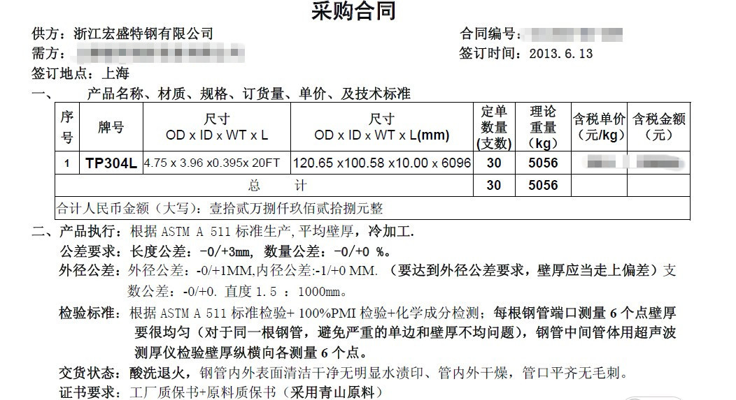質量保證:  質量保證:供方提供不銹鋼管的質保書為產品合格的初步驗證。在檢驗時效內(時效為3個月),如有任何貨物本身質量問題,賣方應承擔退貨或換貨及運費責任;供方也應承擔由于質量不合格而引起的直接損失貨款,退貨、檢驗費用、運輸費用以及延期交貨引起的相關損失(如供方供貨拖期,每天按照合同額的0.5%承擔拖期賠償金,但最高不超過合同總值的10%。如供方拖期超過30 天,需方有權解除合同,并收回所有預付貨款及拖期賠償金)